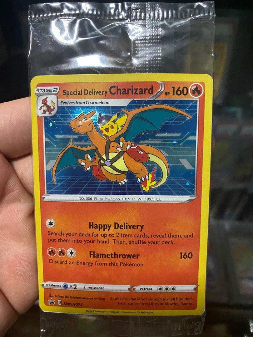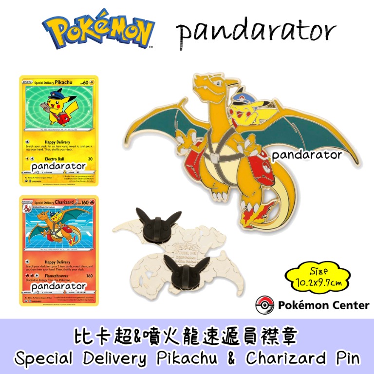 The Special Delivery Charizard card will be packaged in a plastic sleeve along with another piece of material to stabilize it. Special Delivery Pikachu Riding Charizard Pin. Special Delivery Pikachu Charizard Pokémon Pin.